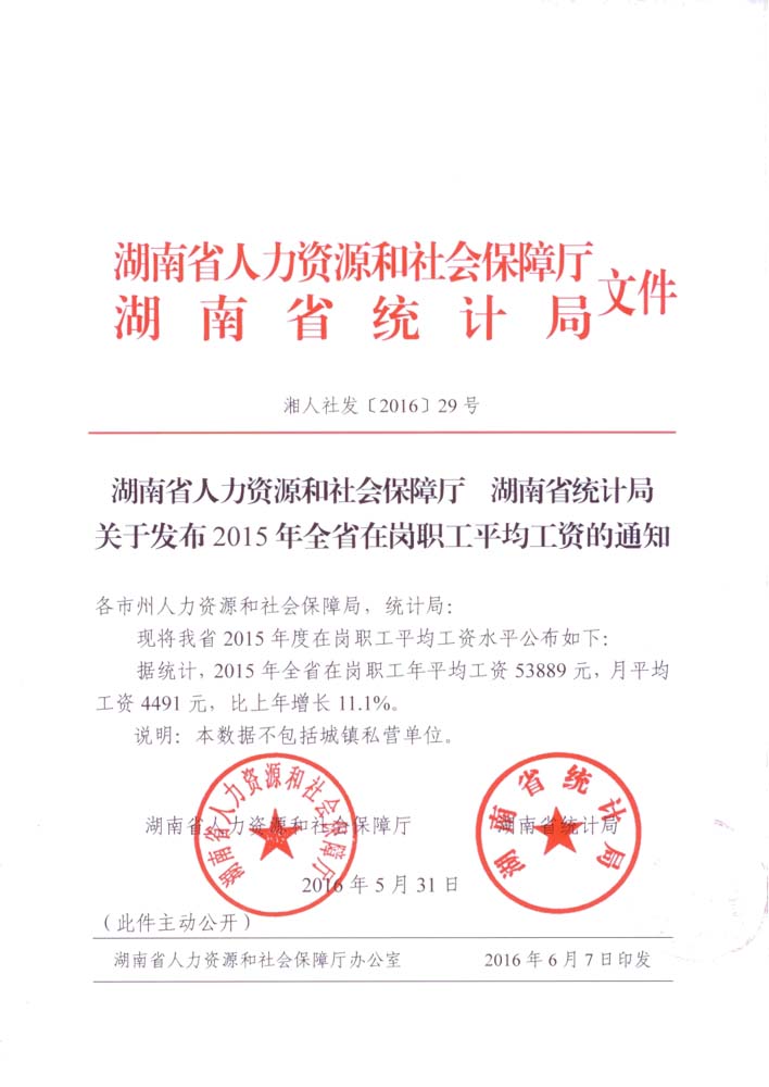 湖南省人力資源和社會保障廳,湖南省統(tǒng)計(jì)局關(guān)于發(fā)布2015年全省在崗職工平均工資的通知
